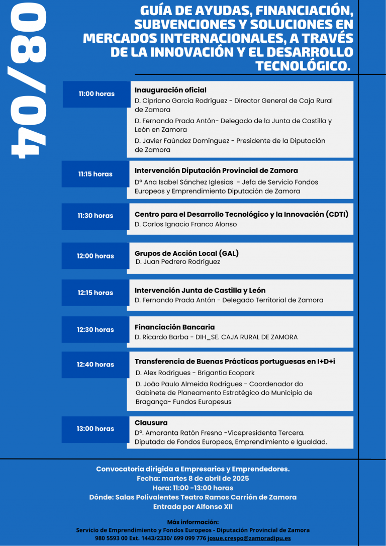El próximo martes 8 de abril en las Salas Polivalentes del Teatro Ramos Carrión de Zamora, el área de Fondos Europeos y Emprendimiento de la Diputación de Zamora, organiza este encuentro empresarial junto con Caja Rural de Zamora que tiene por objeto informar y presentar todas las ayudas, subvenciones y soluciones para optimizar las capacidades financieras y de solvencia que la empresa puede contraer.  Todo ello en el marco del proyecto europeo DIH_SE: Digital Innovation Hub Silver Economy POCTEP-INTERREG.